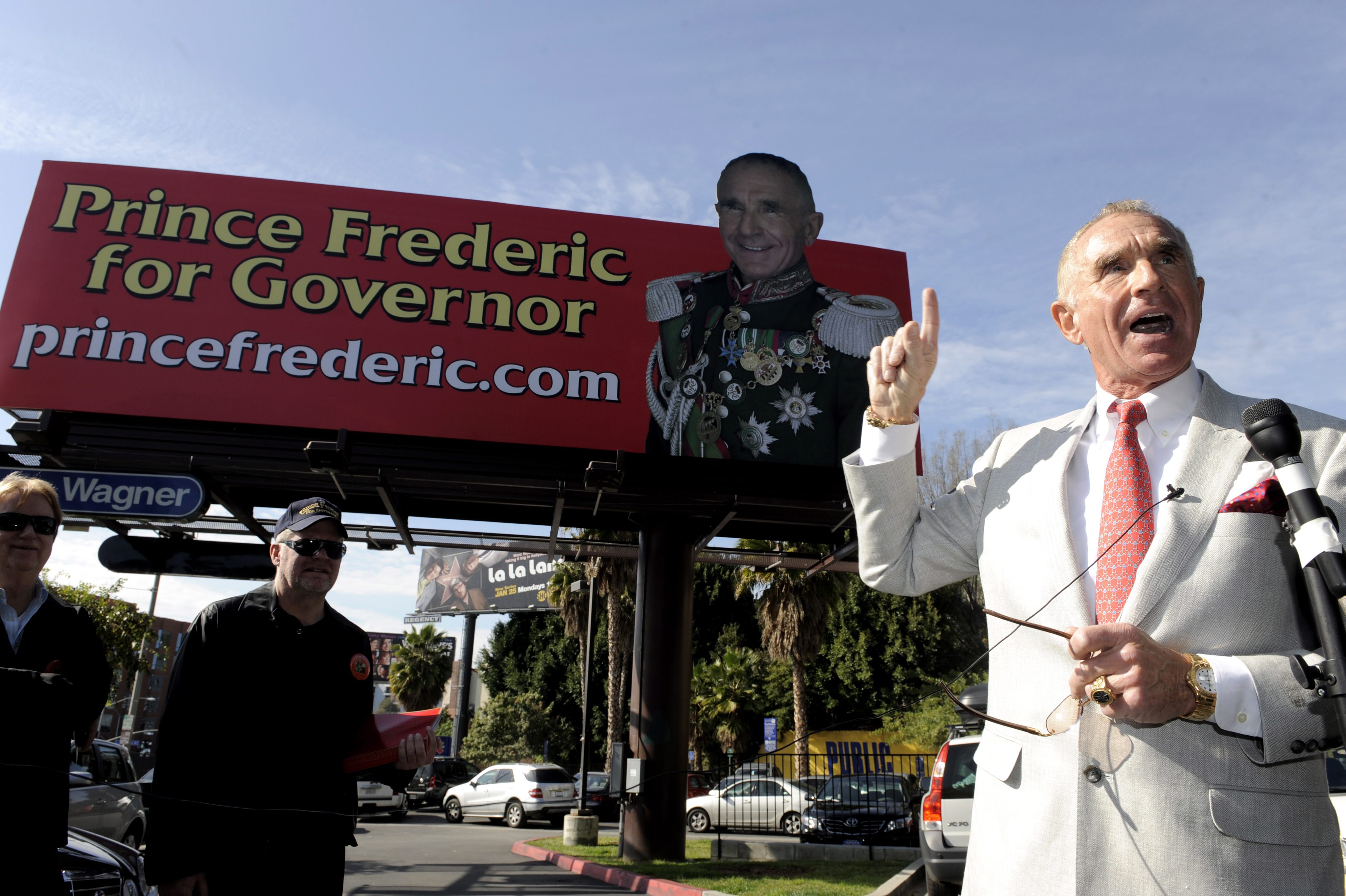 2010. január 26.2010. január 25-én, Friedrich von Anhalt, Szászország és Vesztfália hercege a Los Angelesben található híres Sunset Boulevard leleplezte kampánynyitója részeként az életnagyságúnál jóval nagyobb “Frederic herceget kormányzónak!” feliratú óriásplakátját. A 66 éves herceg a közelmúltban jelentette be, hogy indulni kíván a novemberi kaliforniai kormányzóválasztáson, azonban június végéig 10 ezer támogatói aláírást kell összegyűjtenie, hogy a jelöltlistára kerülhessen.