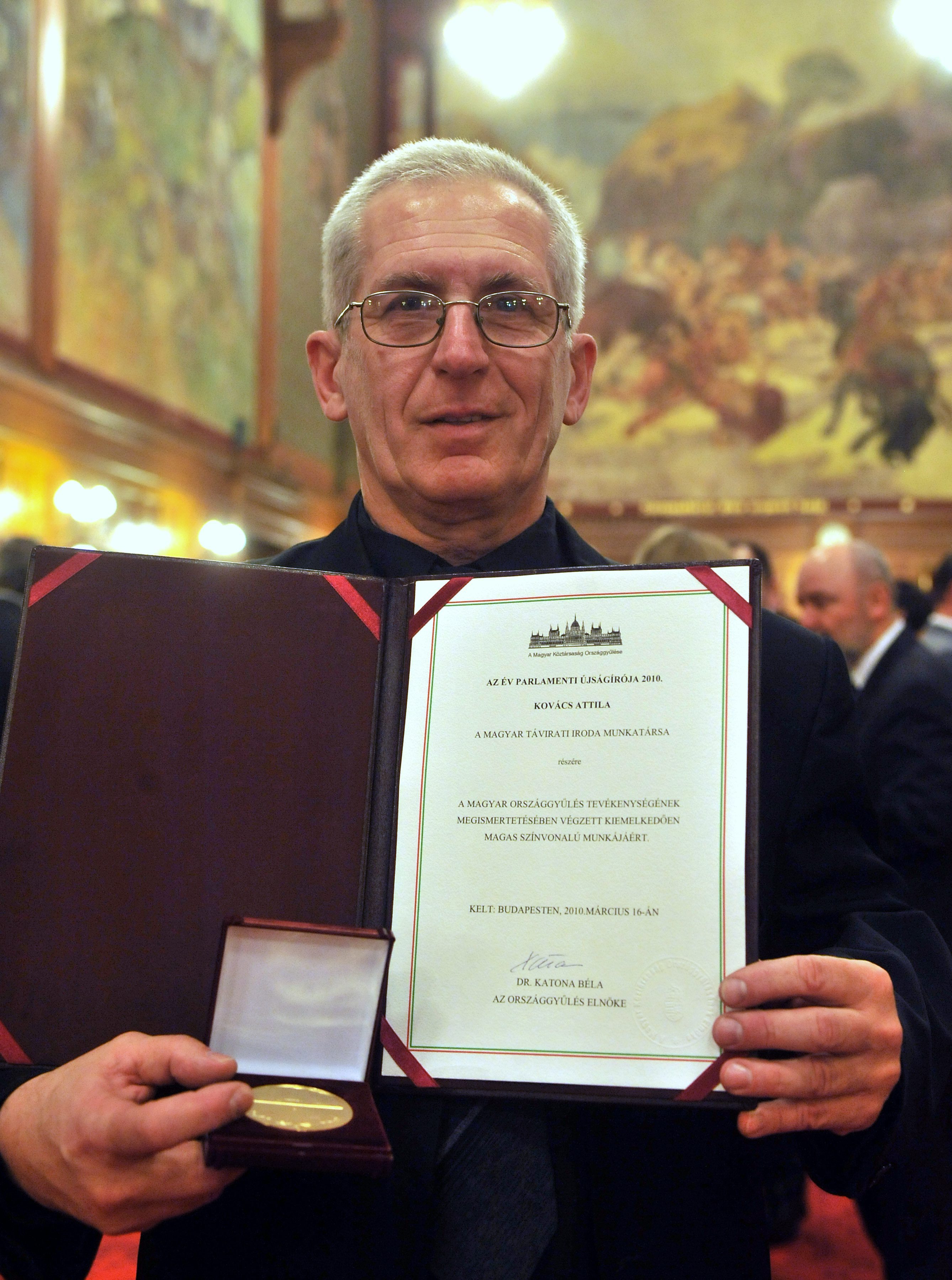Katona Béla, Országgyűlés elnöke 2010. március 16-án átadta az év parlamenti újságírója díjakat a Magyar Sajtó Napja alkalmából a Parlamentben. A rangos elismerést idén Kovács Attila, az MTI fotóriportere, Anyukám közeli munkatársa kapta, akivel gyakran én is találkozom. Gratulálok neki!