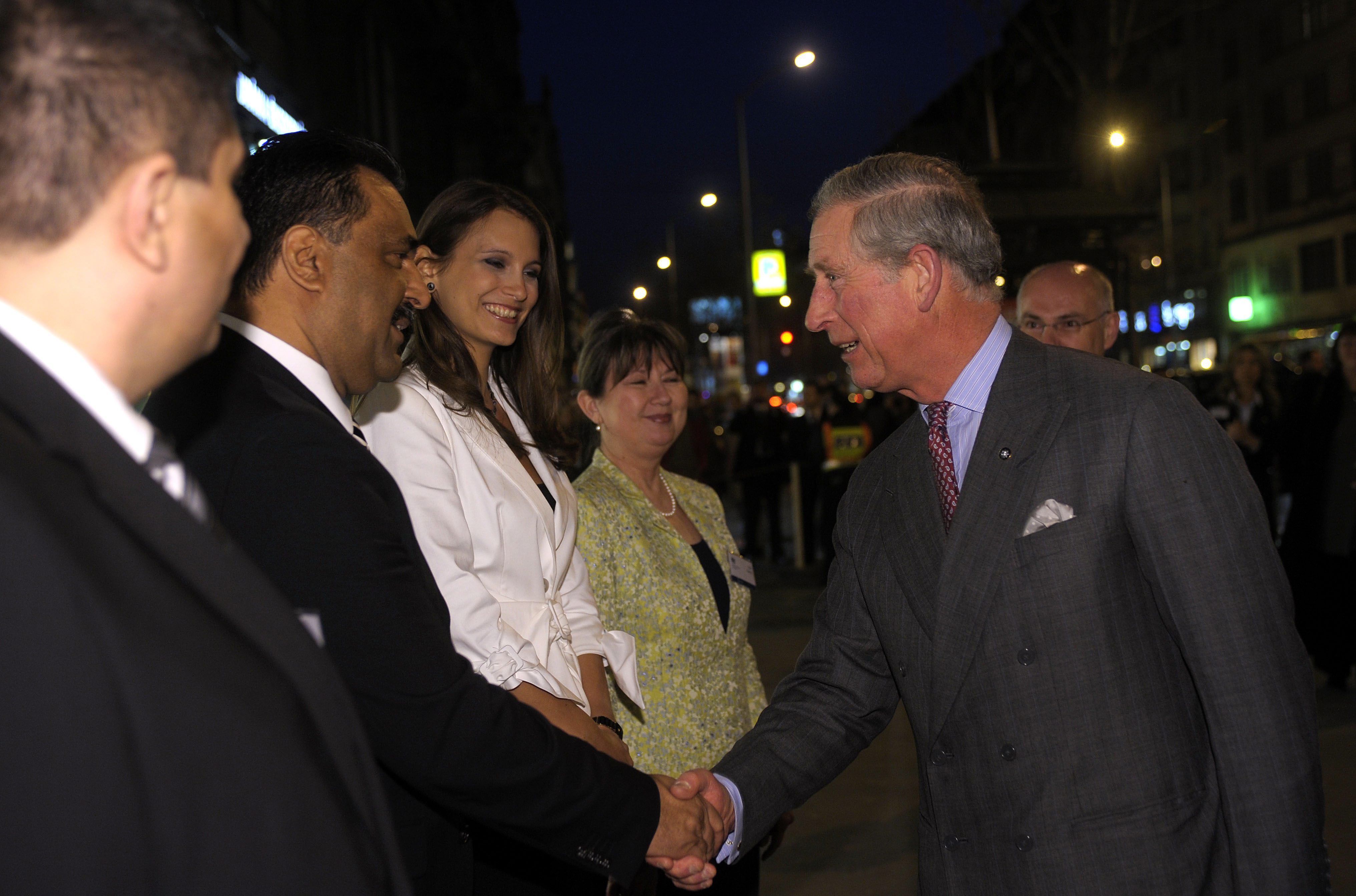 Károly walesi herceg, brit trónökös kezet fog néhány emberrel az Uránia Nemzeti Filmszínház előtt 2010. március 18-án. Balról fehérben Mészáros Antónia műsorvezető, rendezőnő.