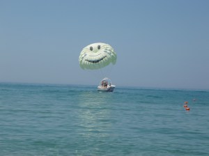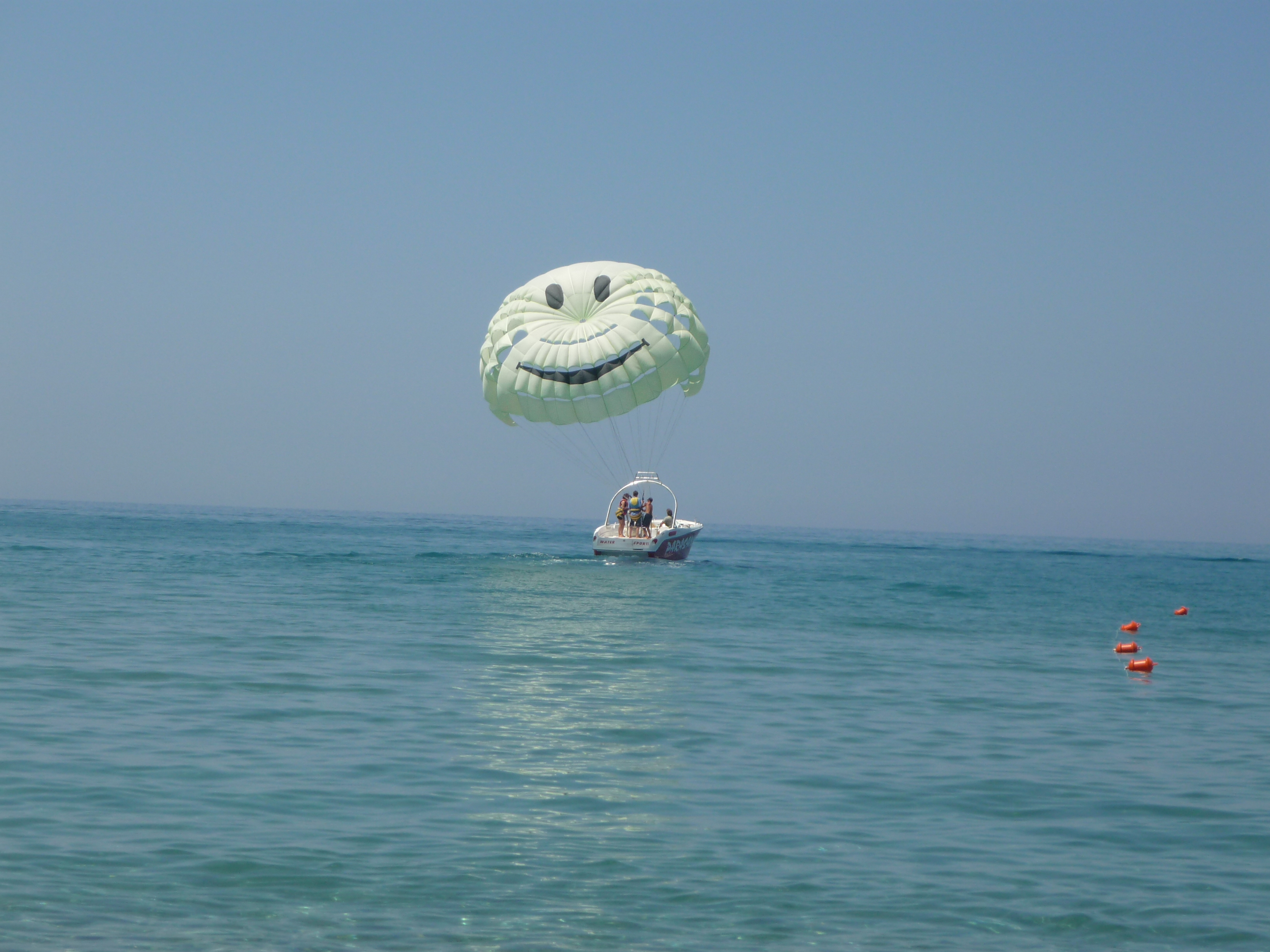 A nyaralás egyik legemlékezetesebb élménye számomra, az volt, amikor július 2-án Anyával “parasailingeztünk”, ami annyit tesz magyarul, hogy a tenger közepéről egy csónakról ejtőernyővel a hátunkon felszállunk a magasba. 150-200 méterről valójában más minden…