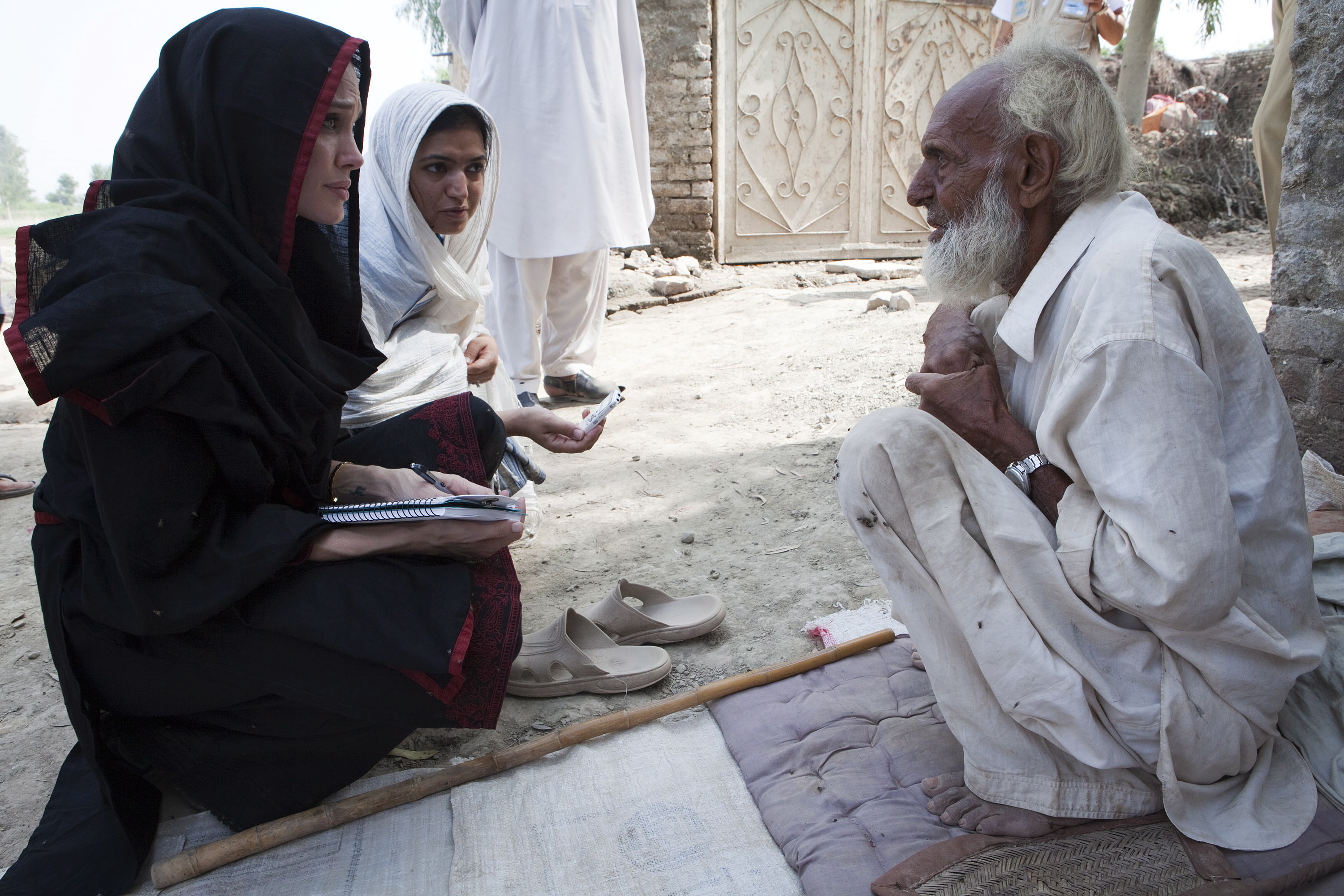 Árvízkárosult idős emberrel beszél Angelina Jolie Oscar-díjas amerikai színésznő a pakisztáni Nausera táborában 2010. szeptember 7-én