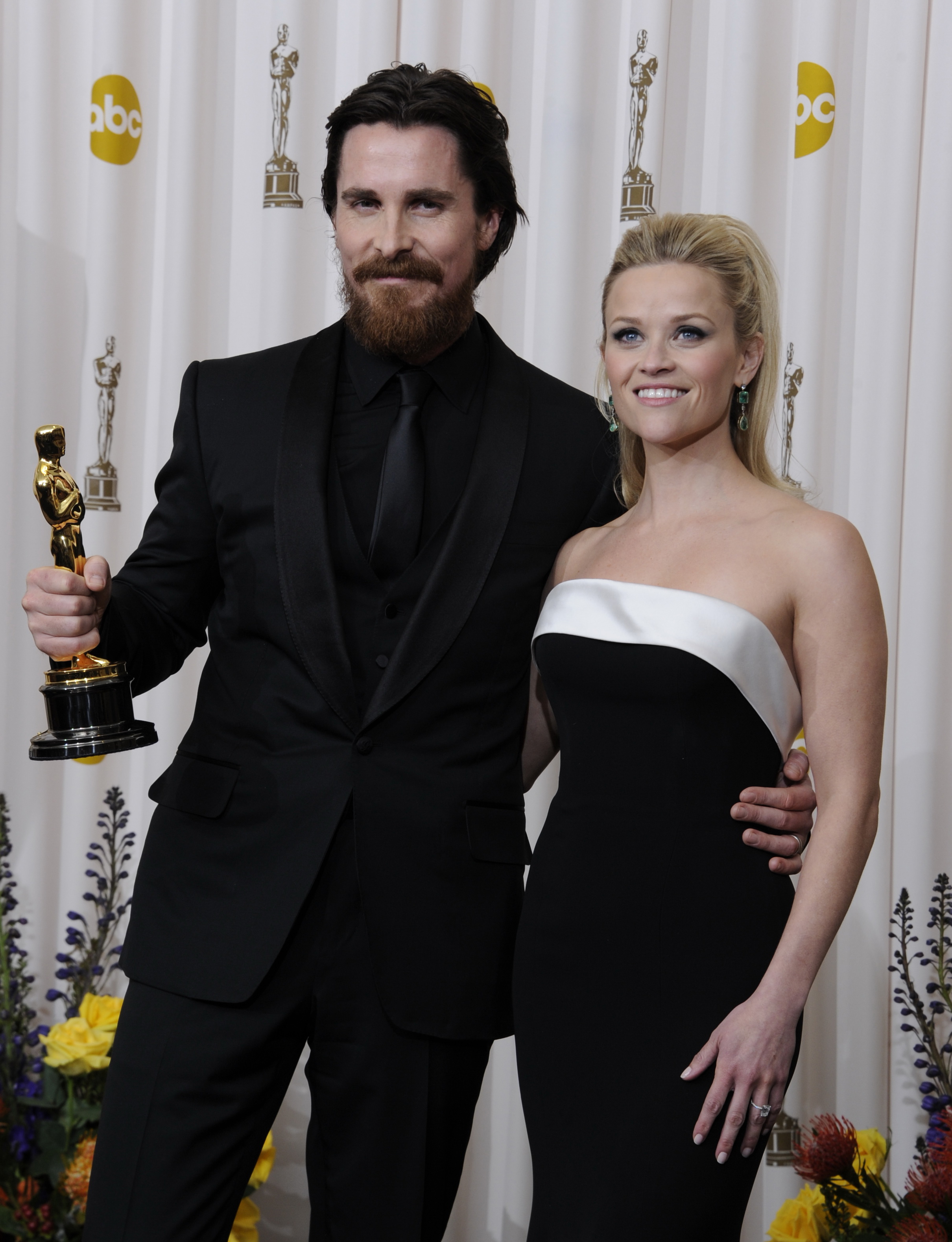 A friss Oscar-díjas Christian Bale brit színész és elismerésének átadója, Reese Witherspoon amerikai színésznő a 83. Oscar-díjkiosztón Los Angelesben 2011. február 27-én