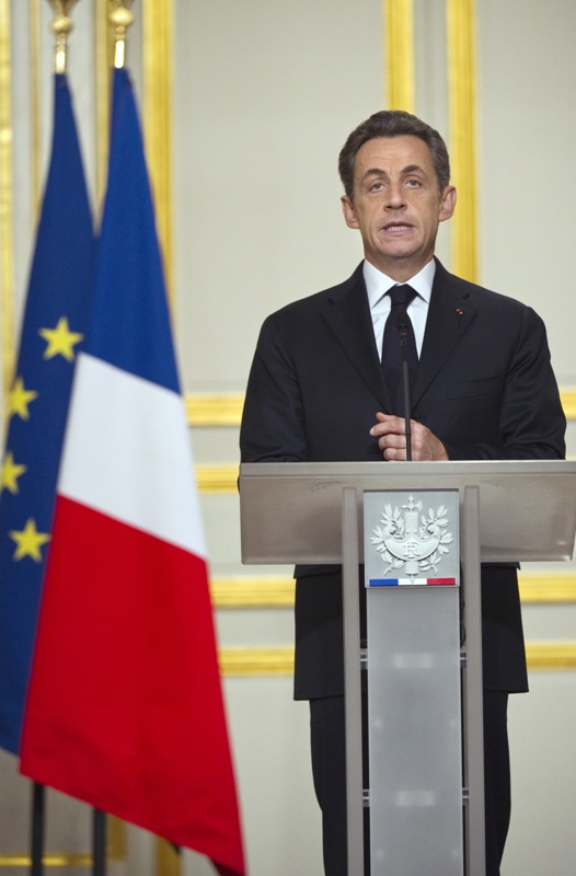 Nicolas Sarkozy francia elnök a líbiai válságról szóló párizsi csúcstalálkozóján bejelenti 2011. március 19-én, hogy azonali fegyveres fellépést indítanak Líbia ellen