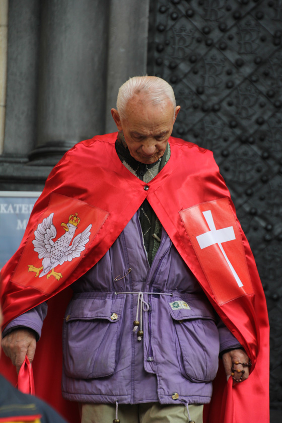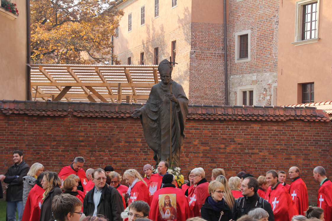 A város híres szülöttének, II. János Pál pápának a szobra előtt álltunk, amikor a templomból mise után nagyon sok vörös köpenyt viselő hívő jött ki. A ruhájukon hátul egy Jézus kép volt, elől pedig egy kereszt, ebből arra következtetek, hogy valamiféle lovaggá avatási szertartás lehetett.