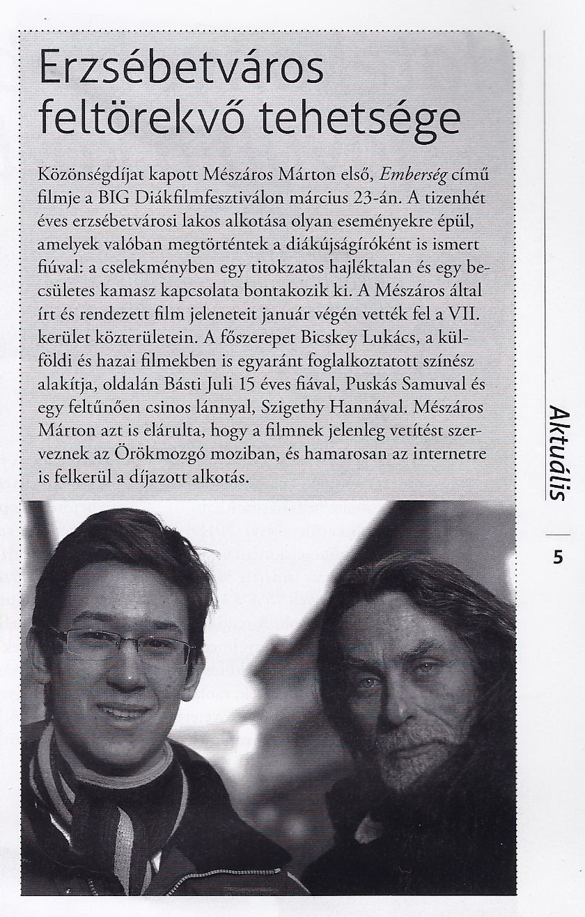Az Erzsébetváros című kéthetente megjelenő 7. kerületi lap 2012. április 5-i számában “Erzsébetváros feltörekvő tehetsége” címmel jelent megy cikk az Emberség című filmemről. A cikk Szilasi Katalin a forgatáson készített egyik képét is tartalmazza, amelyen Bicskey Lukáccsal, a film főszereplőjével vagyok látható.