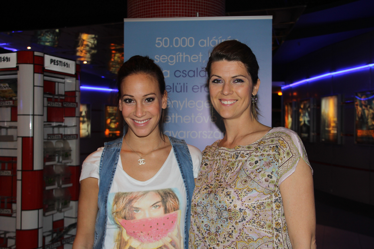 Palácsik Tímea, az erőszakos közösülés és más bűncselekmények miatt elítélt Damu Roland sorozatsztár egykori párja, és Jaksity Kata műsorvezető a családon belüli erőszak elleni kampányon a budapesti Mammutban 2012. április 22-én (Fotó: Mészáros Márton)