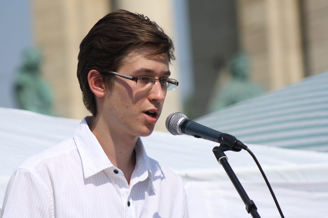 A rokkantak, fogyatékkal élők, az idősek és az elesettek jogaiért tartott demonstráción a saját versemet olvasom fel a Hősök terén 2012. július 1-jén. (Fotó: Szilasi Katalin)