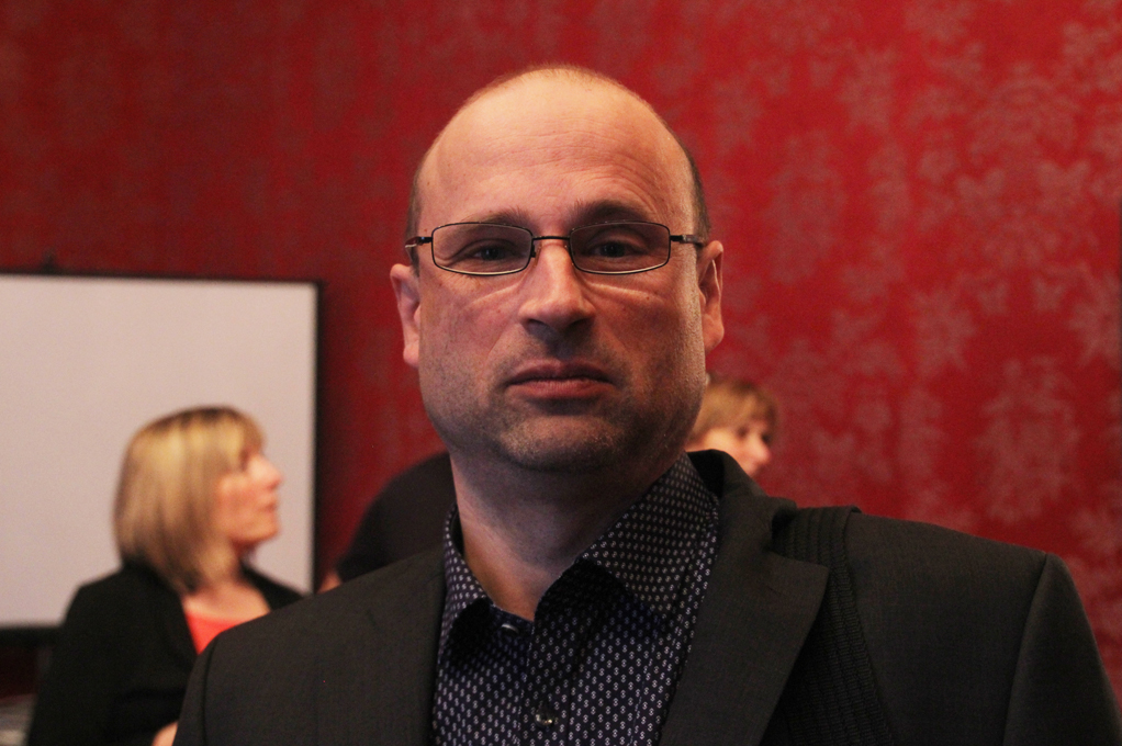 Csabai László író, miután átvette a Békés Pál-díjat a Petőfi Irodalmi Múzeumban 2014. március 28-án (Fotó: Mészáros Márton)
