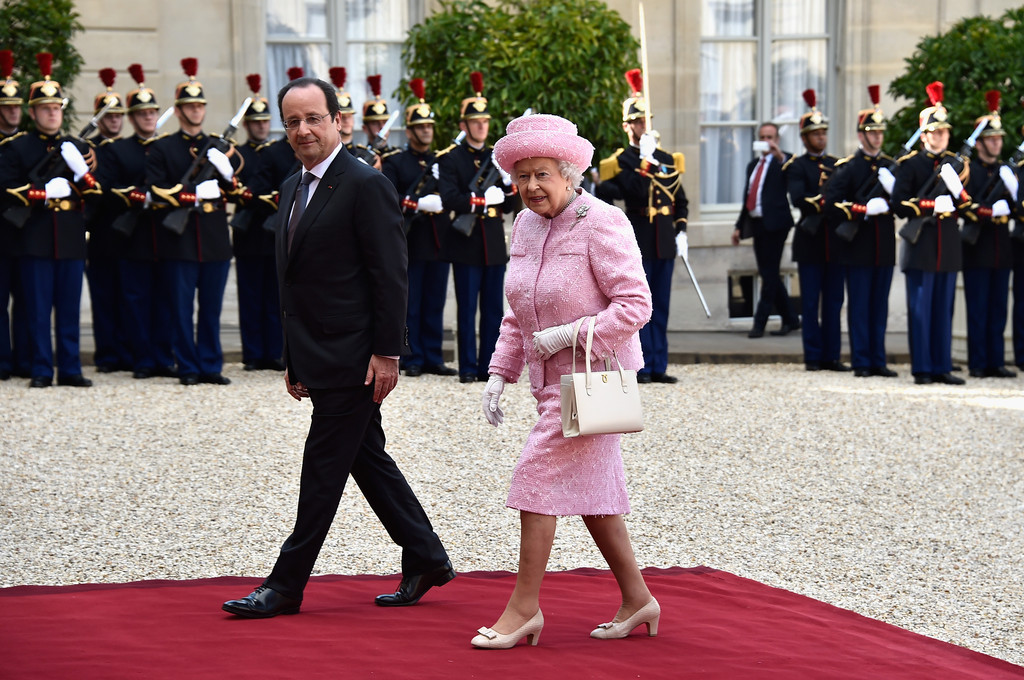 A délután folyamán a párizsi államfői rezidencián, az Elysée-palotában Francois Hollande francia elnök fogadta a korábban még krémszínű kosztümöt viselő királynőt, aki a találkozóra már rózsaszín viseletet és azonos színű kalapot választott. A királynő és a francia elnök limuzinban hajtott végig a Champs-Elysées sugárúton a köztársasági gárda 146 lovasának kíséretében., miközben ezrek integettek nekik. Az elnök és a királynő koszorút helyezett el az ismeretlen katona sírjánál is. Az este folyamán II. Erzsébet a tiszteletére rendezett kerti partin vett részt a párizsi brit nagykövetség épületében. Az ezt követő díszvacsorára, amit az államfői rezidencián adnak, kétszáznegyven vendég hivatalos.