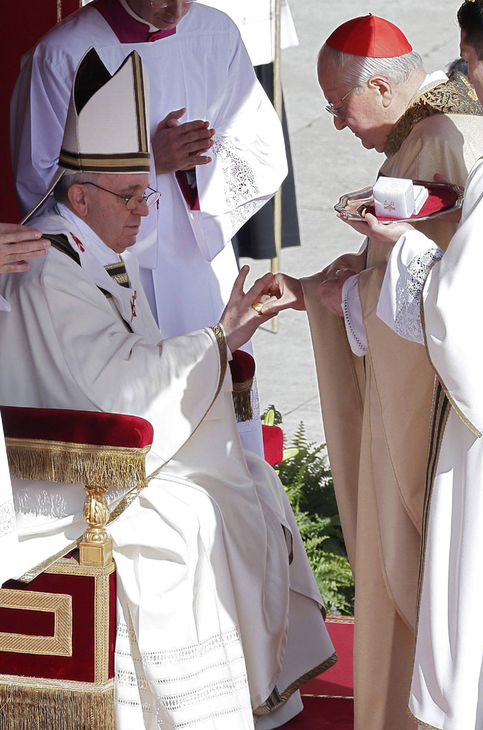 Az olasz Angelo Sodano bíboros, a bíborosi kollégium dékánja átnyújtja a halászgyűrűt Ferenc pápának beiktatási miséjén a vatikáni Szent Péter téren 2013. március 19-én